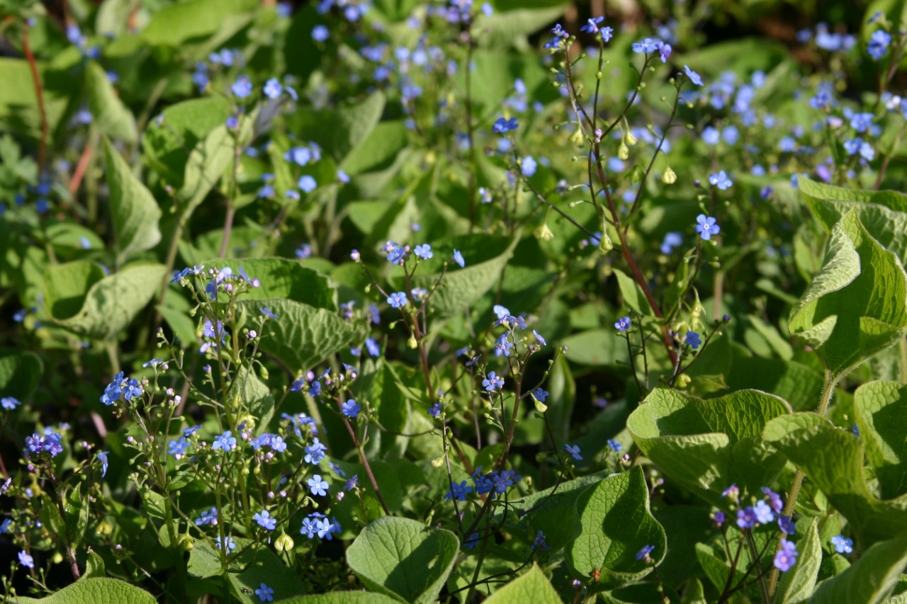 Brunnera macrophylla heeft helder blauwe bloemen in het voorjaar, prachtig diepdonkergroen blad in de zomer. Mooie en sterke bodembedekker.
