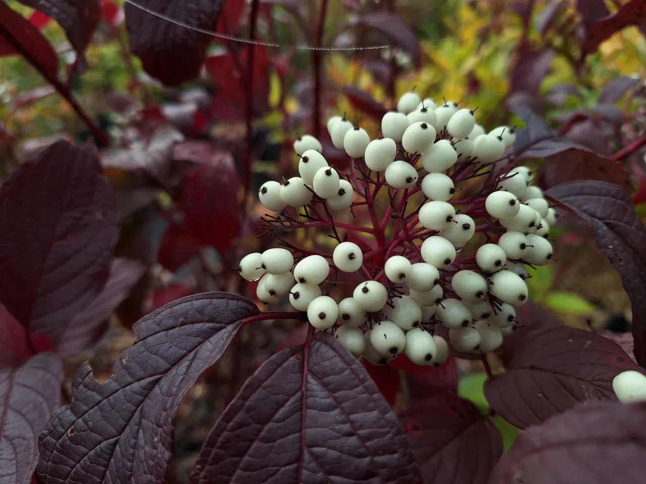 Een veelzijdige kornoelje; in de winter hebben de rode takken grote sierwaarde, in de zomer de schermen witte bloemetjes, later wijnrode herfstverkleuring met daar boven trosjes witte bessen!