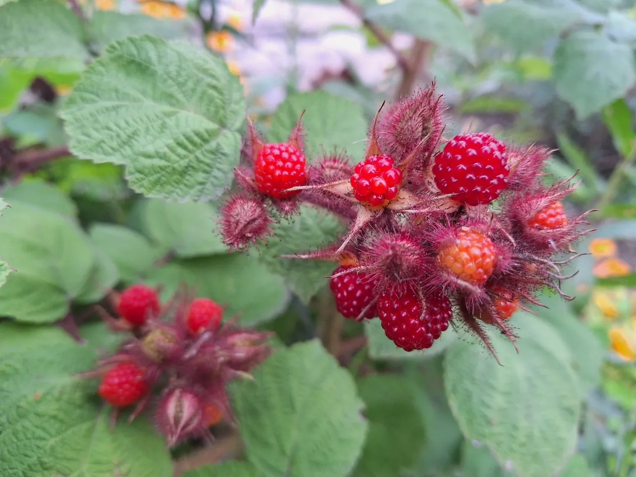 Snelgroeiende tot 2 meter hoge stekelige plant met buigzame takken. De stekels, ze zijn als borsteltjes, hebben een rode kleur en sieren de lange takken. De besjes lijken wat op frambozen maar ze smaken anders en zijn wat minder zacht. Hierdoor zijn ze wat langer te bewaren en beter te vervoeren. Veel kinderen zijn dol op dit zoete rode vruchtje en snoepen de besjes met plezier rechtstreeks van de plant. Rubus phoenicolasius is niet zelf hechtend maar zal je moeten leiden tegen een wand, muur of schutting.